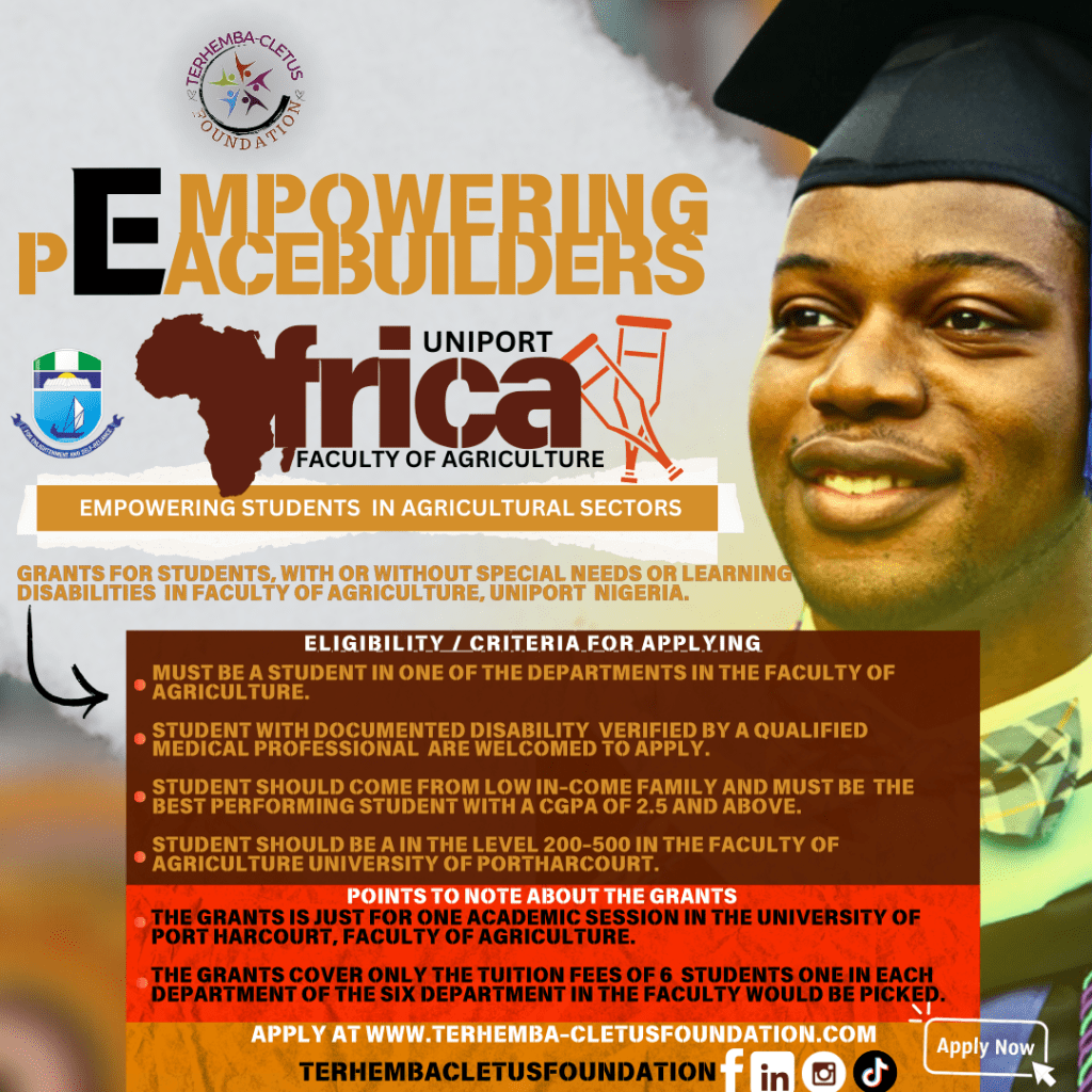 This grant intends to empower and elevate students within the agricultural sectors at the University of Port Harcourt by providing financial assistance to individuals who exhibit excellence, dedication, and potential in their academic pursuits and extracurricular engagements. The Terhemba Cletus Foundation is steadfastly committed to investing in the future of Nigeria’s youth and proudly collaborates with UNIPORT/FACULTY OF AGRICULTURE in fostering the development of the next generation of leaders, innovators, farmers, peacebuilders and changemakers.